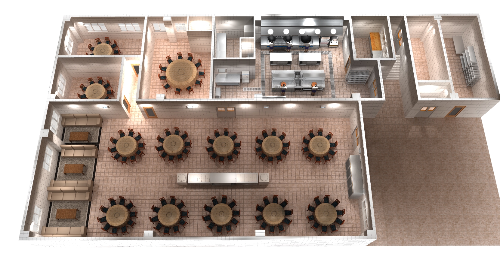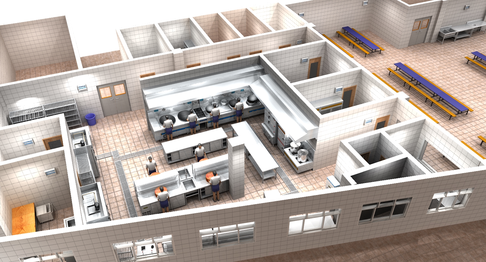 我们可根据客户的各种需求,厨房的具体环境,严格遵循消防、卫生及环保规定,为客户设计一个最佳布局方案和最优化的设备选配,使设备能充分发挥其功能,达到实用、方便、卫生、美观的效果。 同时提供合理的厨房设备布局平面图,相应的给、排水图,电路配置图,排送风系统工程图。